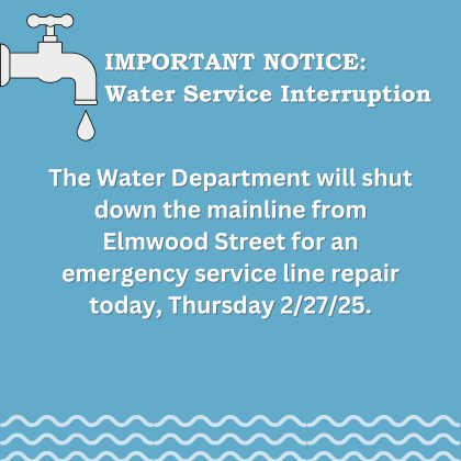The Water Department will shut down the mainline from Elmwood Street for an emergency service line repair today, Thursday 2/27/25. Residents in the area will experience loss of service from about 8:30am - 5:00pm. Water Department staff is on-site to help answer any questions and give residents updates.